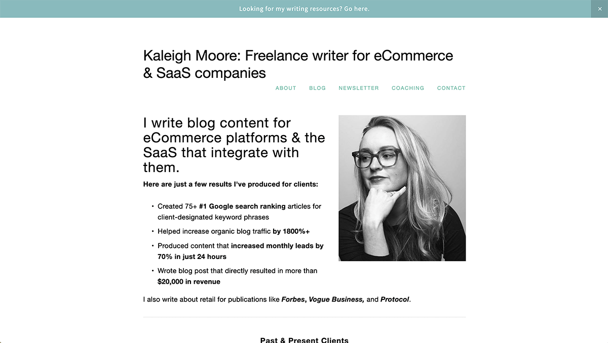 Her website, social media, and past clients all work together to create a personal brand that establishes her eminence so that future clients can see that she is the person to work with if you’re an eCommerce or SaaS company that wants blog content that gets results.