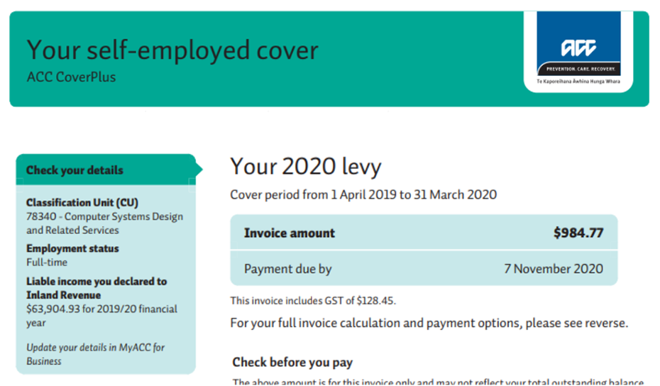 For example, let’s say your original invoice was for $984.77,but ACC had the wrong details for you on the invoice (e.g. Classification Unit, or Employment Status). Your first step will be to contact ACC and get those details updated. ACC will subsequently issue you a credit much like the $422.67 ACC CoverPlus Credit in the image above.
